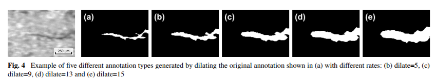 关于数据,作者使用的数据集是KolektorSDD,这是作者自己搜集的数据集。标签有5种,图片尺寸有两种。数据扩增包括90度旋转和标签膨胀(Dilate,详细信息见[4]),标签膨胀见图4。