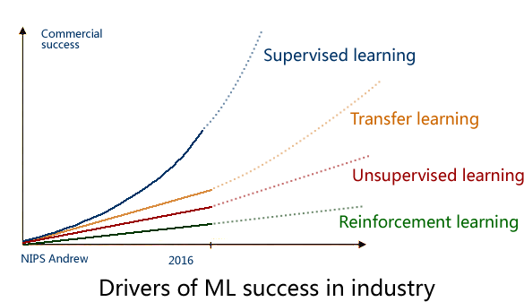 毋庸置疑,监督学习是目前成熟度最高的,可以说已经成功商用,而下一个商用的技术 将会是 迁移学习(Transfer Learning),这也是 Andrew 预测未来五年最有可能走向商用的 AI技术。