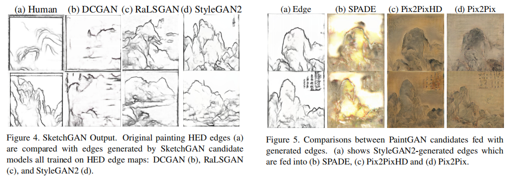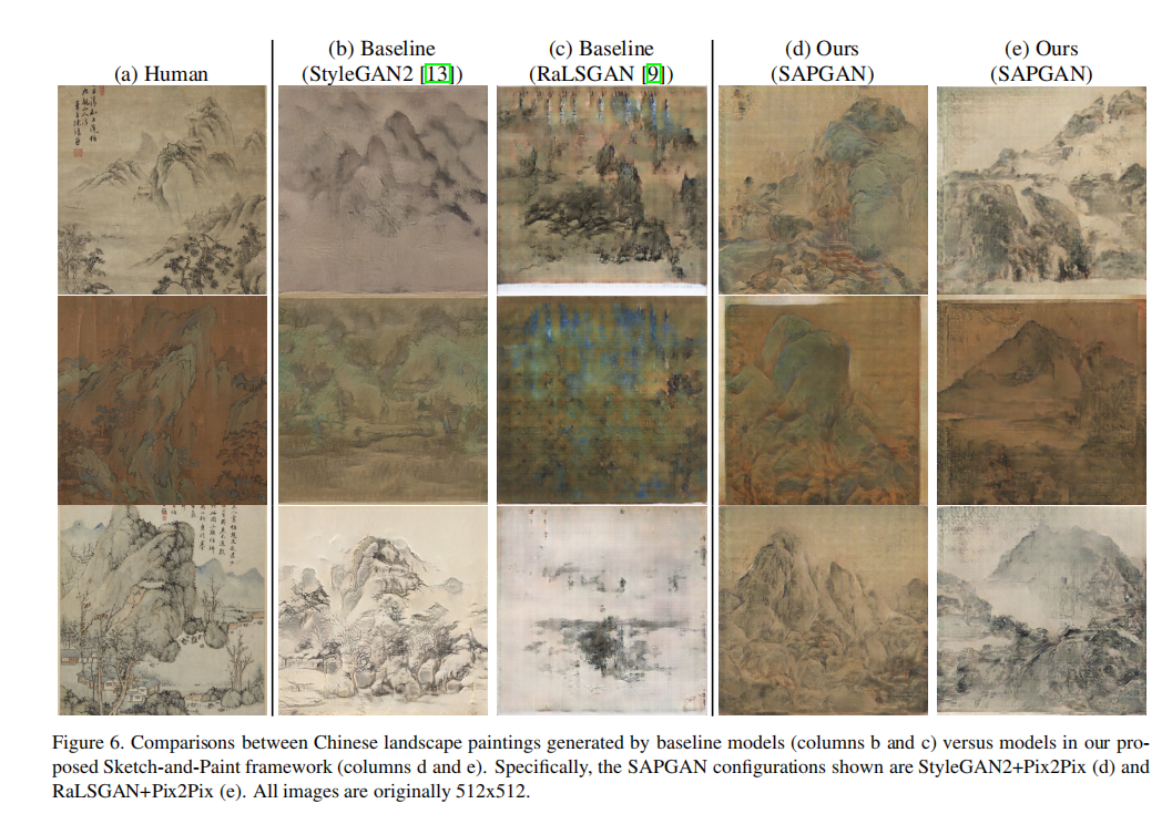 We propose the first model that creates high-quality Chinese landscape paintings from scratch(从无到有). Our proposed framework, Sketch-And-Paint GAN (SAPGAN), splits the generation process into sketch generation to create level structures, and paint generation via image-to-image translation. Visual quality assessments find that paintings from the RaLSGAN+Pix2Pix and StyleGAN2+Pix2Pix configurations for SAPGAN are more edge-defined and realistic in comparison to baseline paintings, which fail to evoke intelligible structures. SAPGAN is trained on a new dataset of exclusively museum-curated, high-quality traditional Chinese landscape paintings. Among 242 human evaluators, SAPGAN paintings are mistaken for human art over half of the time (55% frequency), significantly higher than that of paintings from baseline models. SAPGAN is also robust(健壮的) to over-fitting compared with baseline GANs, suggesting that it can creatively deviate(偏离) from its training images. Our work supports the possibility that a machine may originate artworks.