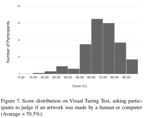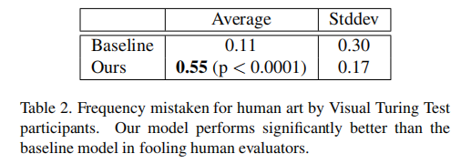 • We present experiments from a 242-person Visual Turing Test study. Results show that our model’s artworks are perceived(认为) as human-created over half the time.