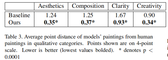 Results. Among the 242 participants, paintings from our model where mistaken as human-produced over half the time. Table 2 compares the frequency that SAPGAN versus baseline paintings were mistaken for human. While SAPGAN paintings passed off as human art with a 55% frequency, the baseline RaLSGAN paintings did so only 11% of the time (p < 0.0001). Furthermore, as Table 3 shows, our model was rated consistently higher than baseline in all of the artistic categories: “aesthetically pleasing,” “artfully-composed,” “clear,” and “creativity” (all comparisons p < 0.0001). However, in these qualitative categories, both the baseline and SAPGAN models were rated consistently lower than human artwork. The category that SAPGAN had the highest point difference from human paintings was the “Clear” category. Interestingly, though lacking in realism, baseline paintings performed best (relative to their other categories) in “Creativity”—most likely due to the abstract nature of the paintings which deviated typical landscape paintings. We also compared results of the native Chinese- versus English-speaking participants to see if cultural exposure would allow Chinese participants to judge the paintings correctly. However, the Chinese-speaking test-takers scored 49.2% on average, signifificantly lower than the English-speaking test-takers, who scored 73.5% on average (p < 0.0001). Chinese speakers also mistook SAPGAN paintings for human 70% of the time, compared with the overall 55%. Evidently, regardless of familiarity with Chinese culture, the participants had trouble distinguishing the sources of the paintings, indicating the realism of SAPGAN-generated paintings.