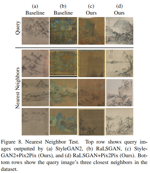 The Nearest Neighbor Test is used to judge a model’s ability to deviate(偏离) from its training dataset. To find a query’s closest neighbors, we compute pixel-wise L2 distances from the query image to each image in our dataset. Results show that baselines, especially StyleGAN2, produce output that is visually similar to training data. Meanwhile, paintings produced by our models creatively stray from the original paintings (Figure 8). Thus, unlike baseline models, SAPGAN does not memorize its training set and is robust to over-fitting, even on a small dataset.