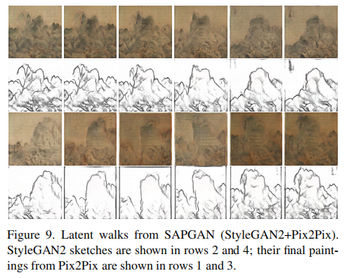Latent walks are shown to judge the quality of interpolations by SAPGAN (Figure 9). With SketchGAN (StyleGAN2), we first generate six frames of sketch interpolations from two random seeds, then feed them into PaintGAN (Pix2Pix) to generate interpolated paintings. Results show that our model can generate paintings with intelligible landscape structures at every step, most likely due to the high quality of StyleGAN2’s latent space interpolations as reported in.