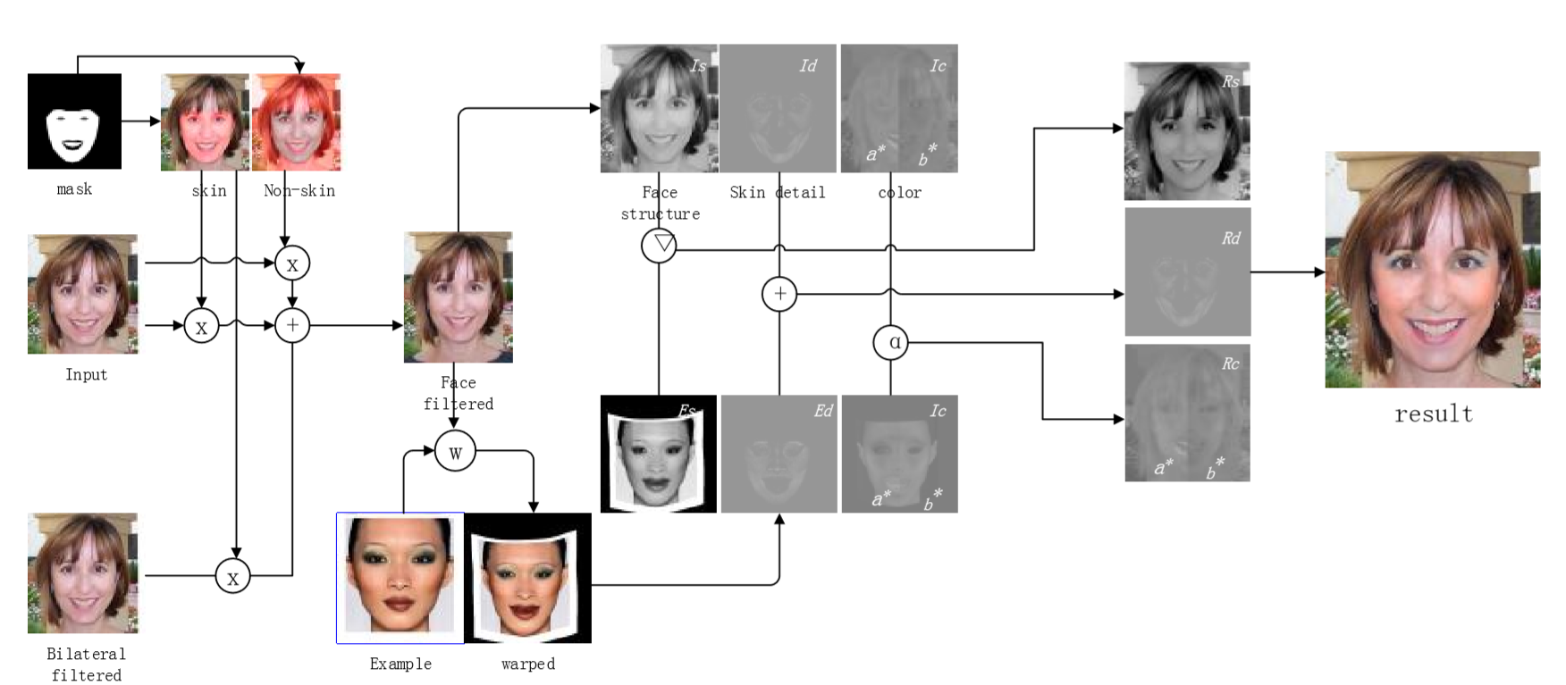 With the skin mask obtained in 2.1 we use a poison image editing method [13] to mosaic input and filtered images together.