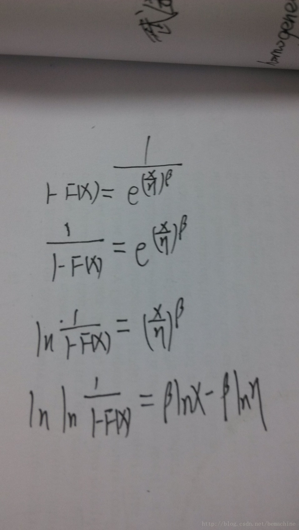 根据上面的讨论,如上式所示,如果我们有一些故障发生的时间点 x, 且知道对应的F(x)的值,就相当于知道了一些二维的数据点,可以用最小二乘法估计beta和eta。