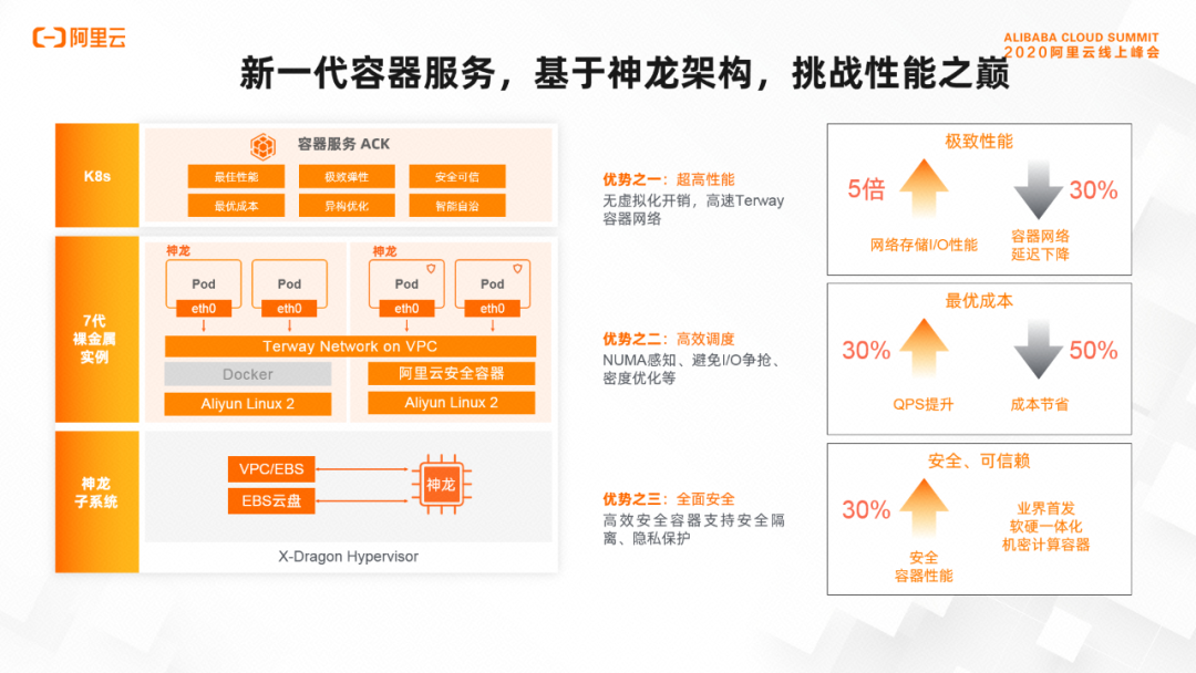 新一代神龙架构具备业界第一的 I/O 转发能力,提供最高 100G 网络带宽;阿里云高速 Terway 容器网络通过网卡直通和数据平面加速,延迟下降30%。