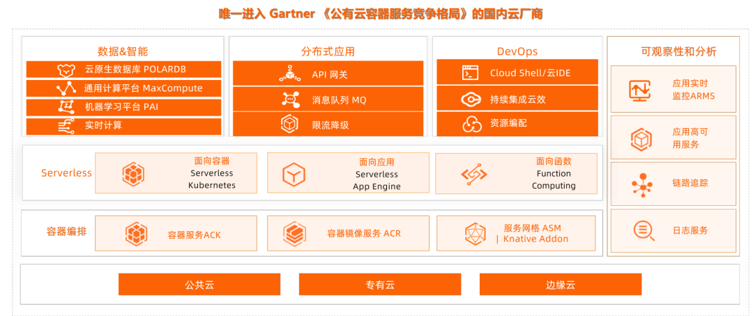 Gartner今年4月发布2020年容器公有云竞争格局报告,阿里云再度成为国内唯一入选厂商。报告显示,阿里云容器服务在中国市场表现强劲,产品形态丰富,在如Serverless容器、服务网格、安全沙箱容器、混合云和边缘等领域,具备良好的技术发展策略。而在今年3月,Gartner第二次公开《竞争格局:公共云容器服务》年度调研报告,报告针对Serverless、Kubernetes、服务网格、容器镜像等十项功能维度进行对比,阿里云和AWS覆盖九项产品能力,产品丰富度领先Google、微软、IBM和Oracle四家厂商。