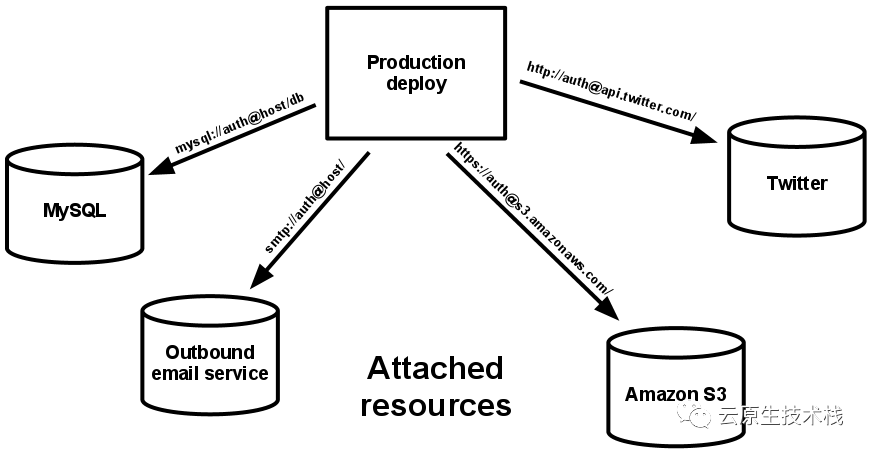 每个不同的后端服务是一份资源 。例如,一个 MySQL 数据库是一个资源,两个 MySQL 数据库(用来数据分区)就被当作是 2 个不同的资源。12-Factor 应用将这些数据库都视作 附加资源 ,这些资源和它们附属的部署保持松耦合。