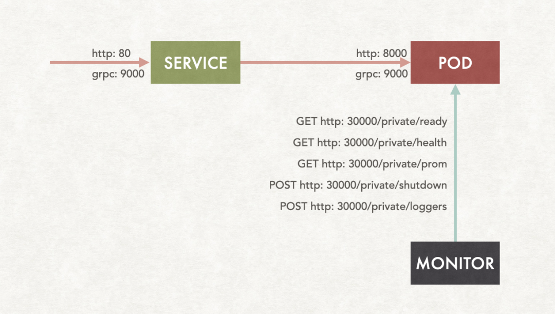 • 提供Prometheus监控接口/private/prom:返回 prometheus标准数据结构;• 提供优雅停机接口/private/shutdown:POST请求即代表发起停机操作;• 提供健康检查的接口/private/health:http code返回200代表健康;• 提供应用ready接口(可以与健康检查接口相同)/private/ready:http code返回200代表ready;• 提供实时修改日志级别的接口:/private/loggers 。这个接口,我们可以参考Java的Logback框架的实现。