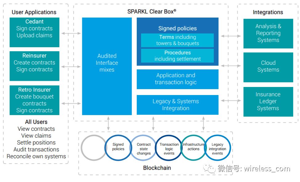 Sparkl 已经发布了一个PoV , 展示了区块链链技术及其自身服务如何可以用来为再保险市场建立智能合约。 Sparkl 与多个分布式分类账项目兼容, 包括 BigchainDB、 HyperLedger 和英特尔 Sawtooth Lake, 后者用于再保险编制(图3)。