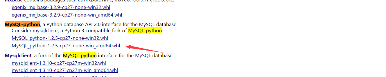 访问: http://www.lfd.uci.edu/~gohlke/pythonlibs/,下载MySQL_python-1.2.5-cp27-none-win_amd64.whl