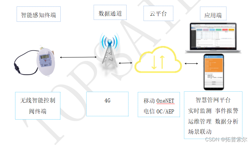 - 4G:MQTT接入CTWing,数据帧格式为拓普索尔私有JSON格式报文;第三方平台支持定制开发与转发方式对接