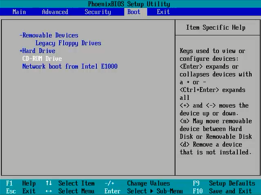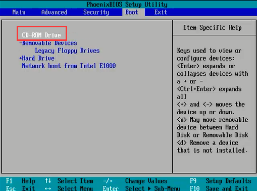 步骤二:使用方向键选择“Boot”,再选择“CD-ROM Drive”,按“+”号键,将其移动到最顶端。
