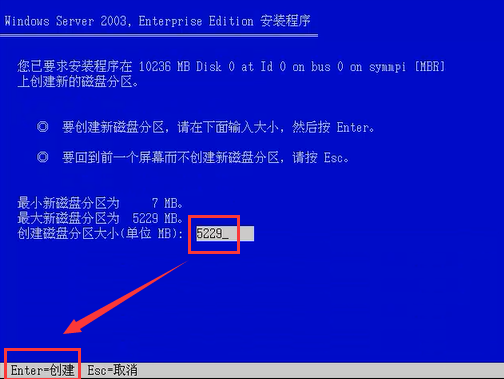 步骤八:输入自己想要设置的磁盘分区的大小,输入完成后,按Enter键确认,返回到上一层面。