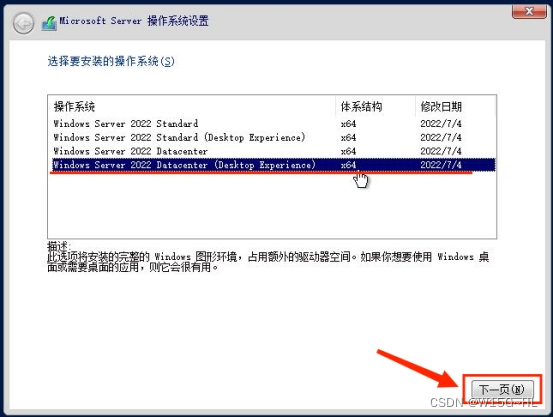 这里我们就选择Windows server 2022中文数据中心图形化的(其实具体也不太清楚),然后下一步