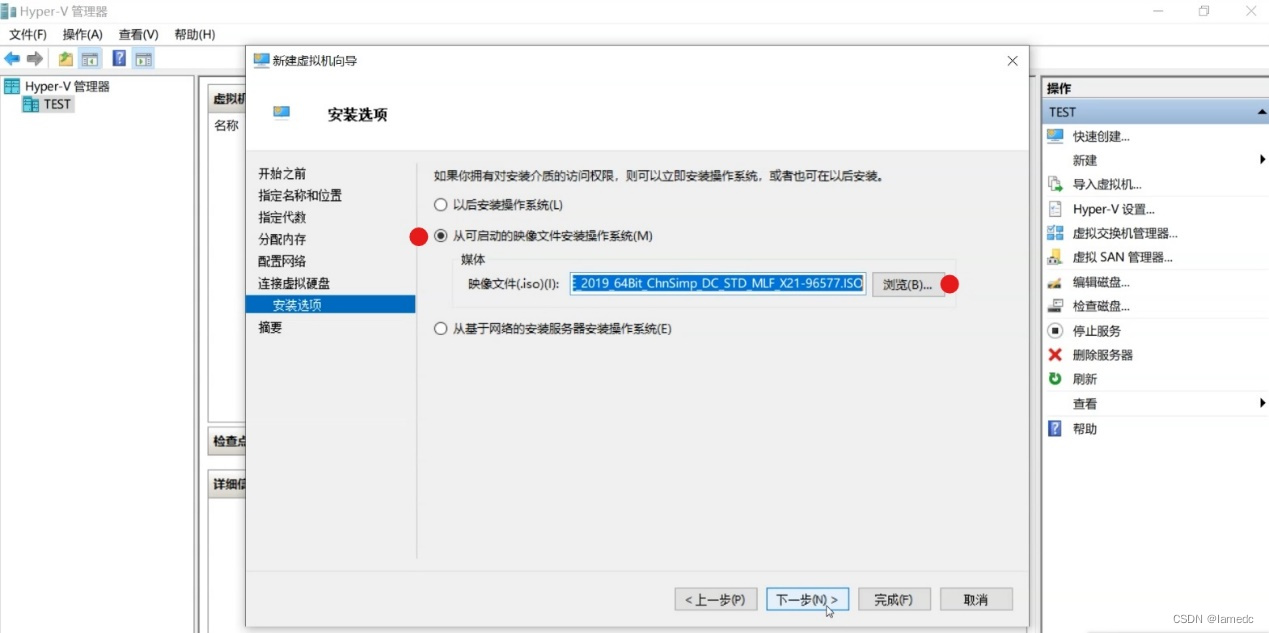 - 选择“从可启动的镜像文件安装操作系统”选中准备好的Window Server 2019. IOS镜像文件,点击——“下一步”