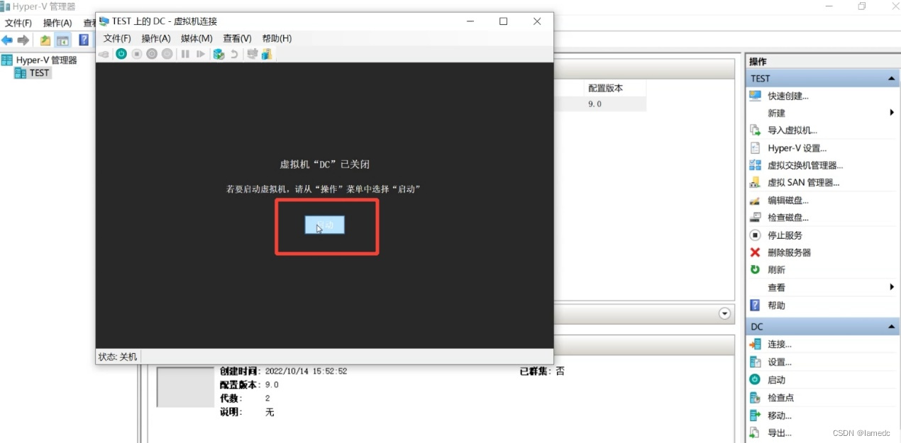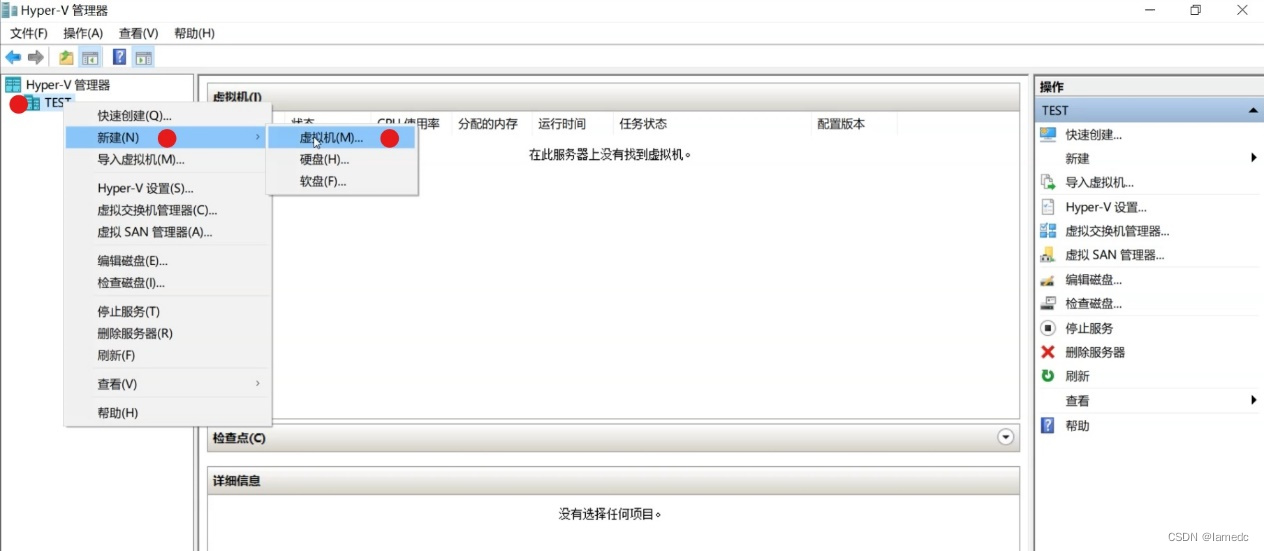 - 打开安装好的Hyper-V管理器,选择test主机右击—“新建”—“虚拟机”