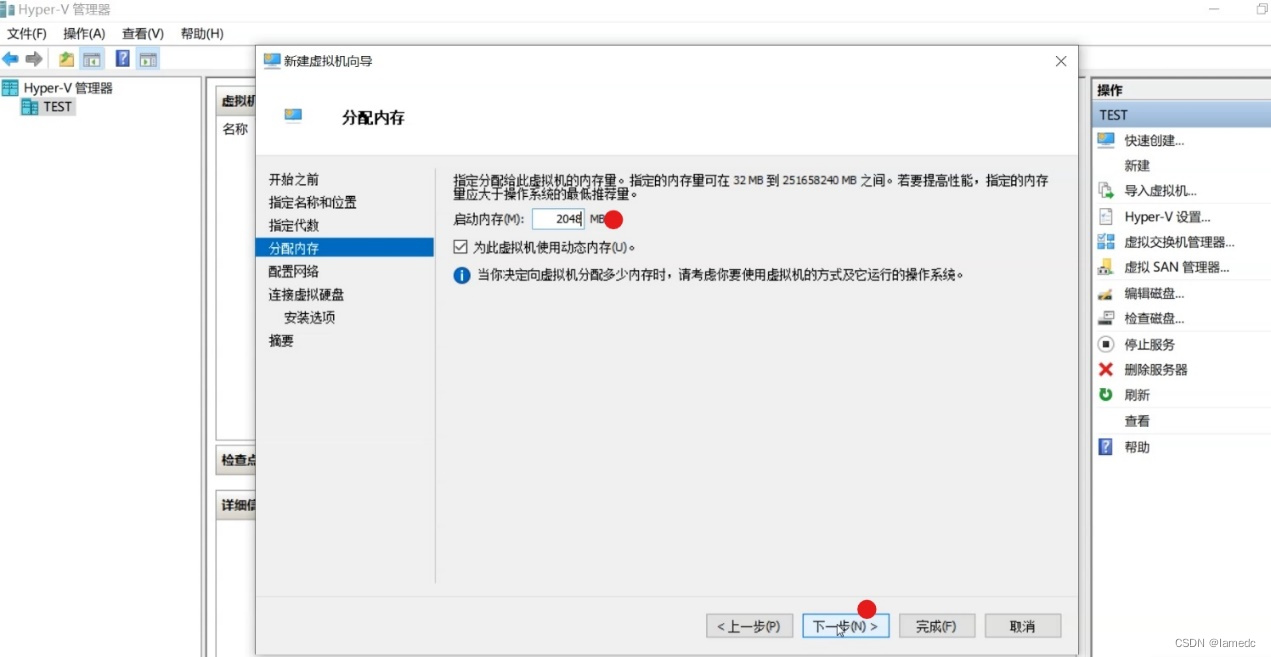 - 分配内存“2048” 点击——“下一步”2G就行,电脑内存大多分一点也行.