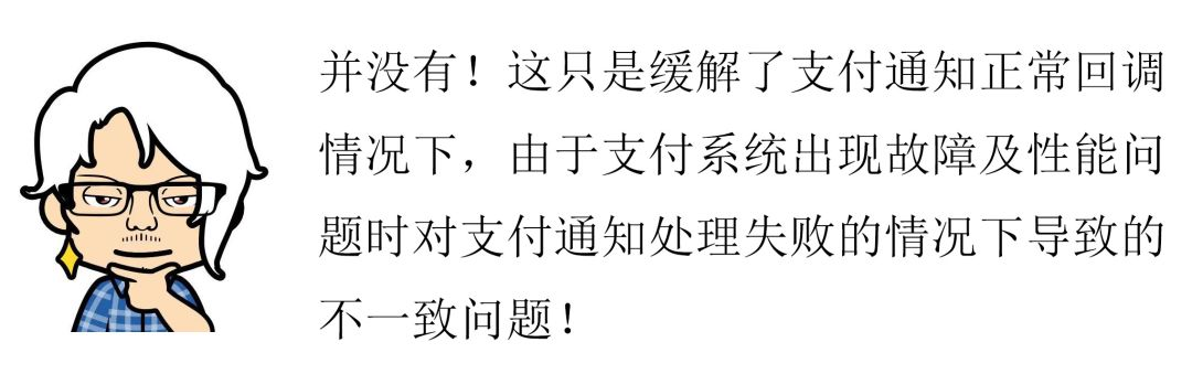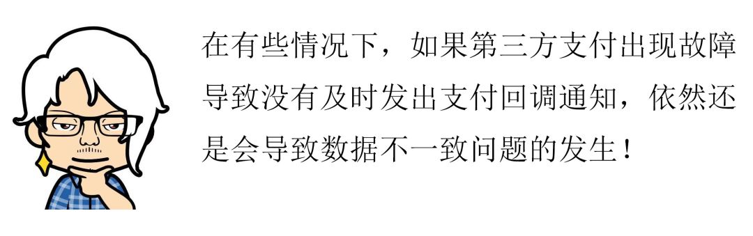 从正常的业务流程上看并没有什么问题,但是由于将接受第三方支付回调及处理支付平台状态逻辑放在同一个事务中,在极端情况下,如支付系统出现故障导致第三方支付渠道无法正常回调、或者由于支付回调量过大而导致支付平台处理回调通知失败的话就会造成数据不一致。