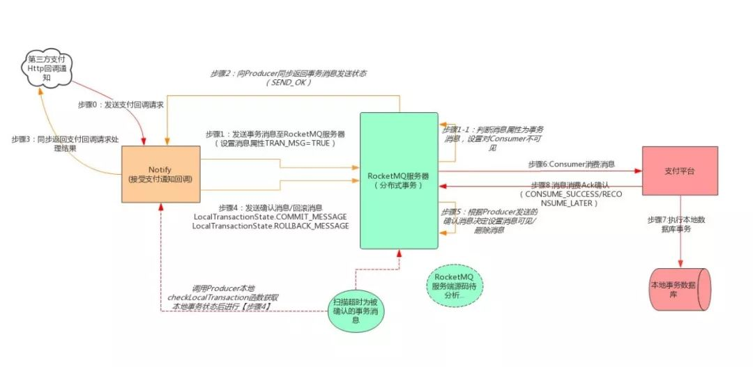 在实时流程中我们利用分布式事务消息主要针对的问题是在正常流程下,支付平台对第三方支付结果回调处理错误、以及支付平台对业务接入方回调逻辑错误的情况下而产生的支付状态数据不一致问题。