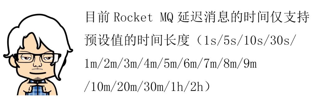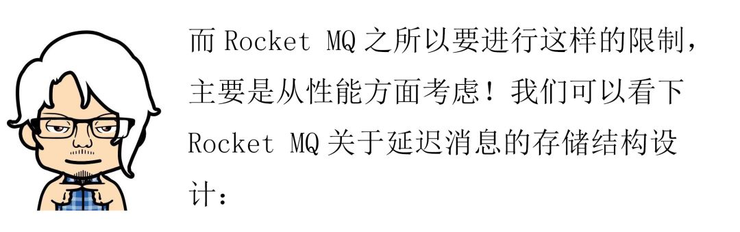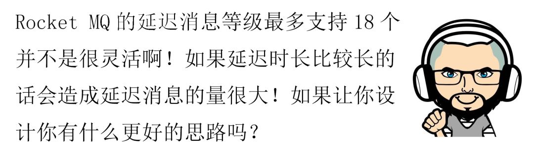 另外一个问题是在Rocket MQ中CommitLog是有时效性的,例如一般只会保存最近7天的数据,过期的数据将被删除。而对于延迟消息,可能需要在30天之后被投递,而这显然是不能被删除的数据,因此如果要在Rocket MQ中实现任意时长的延迟消息,还需要将延迟消息的存储从CommitLog剥离出来单独进行存储!