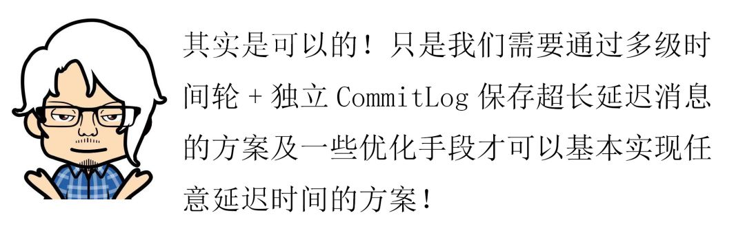 延迟消息在投递后延迟一段时间才对用户可见,如果要支持任意时长的延迟消息,假如支持30天,精度为1秒,按照之前的延迟等级划分,时间轮需要被分割成30*24*60*60=2,592,000个槽,如果支持的延迟时长天数更多,那么时间轮需要被分割的槽的个数还会增加,但是时间轮是需要被加载到内存中操作的,而这显然是不能被接受的。