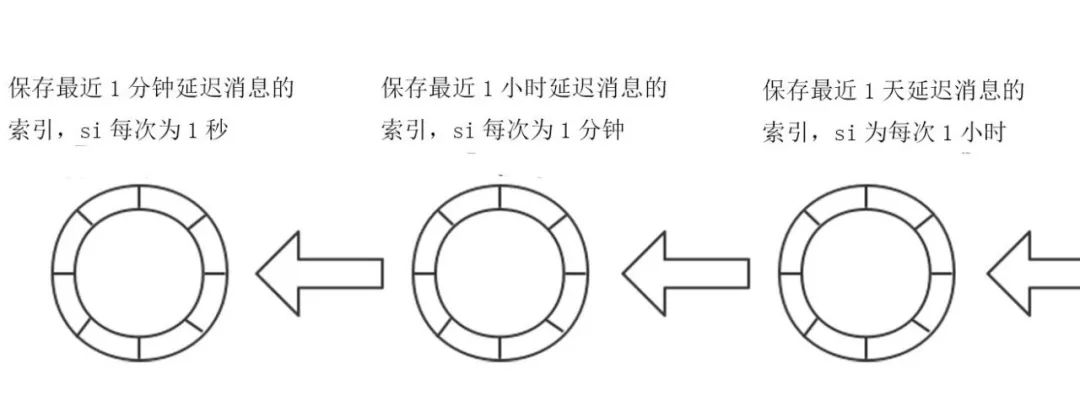 所以单个时间轮的方案是无法实现任意时长的延迟消息,因此需要构建支持时、分、秒的多级时间轮来解决。