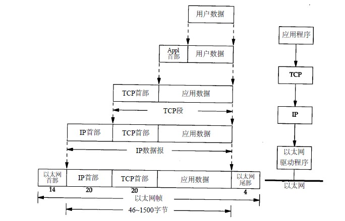 TCP/IP在数据包设计上采用封装和分用的策略,所谓封装就是在应用程序在发送数据的过程中,每一层都增加一些首部信息,这些信息用于和接收端同层次进行沟通,例如当数据从应用程序发送到以太网过程中数据逐层加工的示意图如下所示: