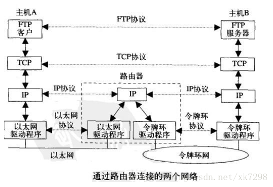 应用层和传输层使用端到端(end-to-end)协议,路由器中没有这两层协议,只有端系统才有这两层协议。网际层是逐跳(hop-by-hop)协议,端系统和路由器都有网际层协议。一个路由器具有两个或多个网络接口,这样才能连接两个或多个网络。互联网的目的之一是在应用程序中屏蔽所有的物理网络细节。在上图中,应用层不需要关心一个端系统是在以太网上还是在令牌环网上,它们通过路由器进行通信。随着不同类型物理网络的增加,互联网的规模变得越来越大,也需要增加路由器,但是应用层仍然是一样的。