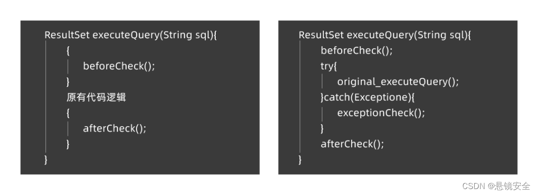 漏洞在被发现并被攻击者利用产生危害时,被定义为一次完整的风险入侵事件。也就是说,如果应用存在漏洞,但攻击者无法利用该漏洞进行下一步操作,则该漏洞风险就不产生危害。RASP的基本原理是利用HOOK技术,通过替换函数体或在函数前后插入检测代码,实现在风险操作执行时进行阻断等。