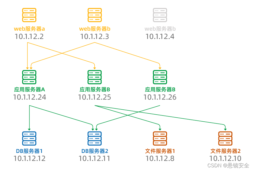 在以往传统纵深防御体系里,通过EDR主机微隔离技术来跟踪描绘主机之间的流量访问关系如下图所示: