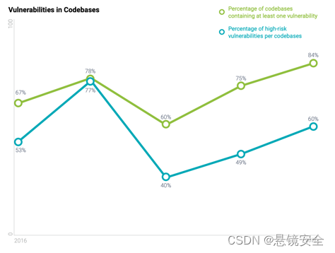 在组件安全层面上,首先遇到的问题,也是最容易发现的问题就是漏洞问题,造成的影响也十分直观,可以导致系统因为恶意的利用导致出现非预期的功能,进一步破坏系统的完整性和可用性。根据2021年Synopsys放出的软件供应链相关的数据显示,开源代码仓库中至少存在一个漏洞的仓库占整体开源仓库的比例从2016年的67%上升到了84%,至少存在一个高危漏洞的代码仓库占全部仓库的比例从2016年的53%上升到了60%,最高的时候是2017年,这一数字是77%。