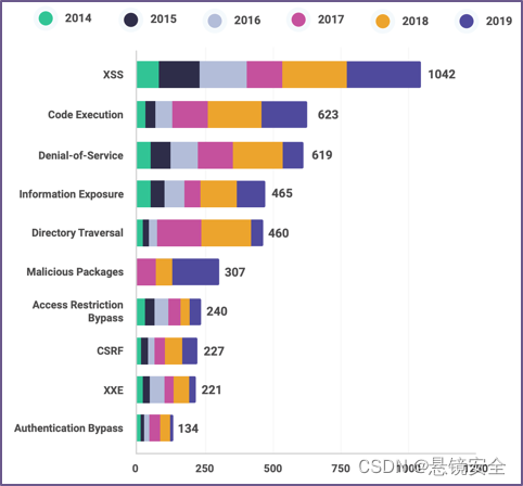 而根据2020年Snyk发布的另一份开源组件与供应链安全的报告显示,漏洞的数量仍然需要提高警惕,XSS漏洞仍然占据数量榜首,紧随其后的是命令执行类漏洞,这些漏洞会严重影响系统的稳定性。