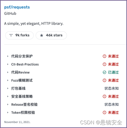 对于风险的基线数据,目前基线建设数据没有一个相对完整的参考标准,但是Google推动成立的OpenSSF基金会(Open Source Security Foundation,在Google等互联网企业和美国政府的推动下成立的开源组件安全基金会)在2021年下旬发布的ScoreCard功能是一个很好的参考标准,结合同样是OpenSSF推出的AllStar基线检测工具,可以完美补充组件基线相关的数据。