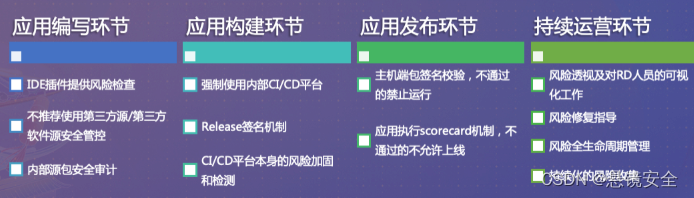 除了SCA提供的风险透视能力,在整个DevSecOps环节,安全团队、质量效率团队、运维团队和业务团队需要非常默契的配合,大家各司其职共同解决研发方面的风险,在这其中,安全团队能够提供的,除了风险数据和修复建议之外,还需要提供一些对应的基础设施帮助业务团队更高效地处置风险。扩展到整个开源软件风险治理方面,也可以给大家一个cheatsheet做参考。