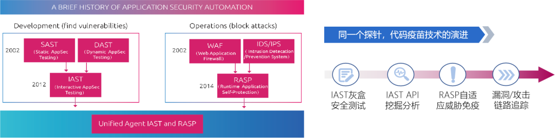 宁戈在分享代码疫苗技术的过程中,重点分析了基于单探针的IAST(交互式应用安全测试)和RASP(运行时应用自保护)两大核心技术的实现原理以及漏洞链路追踪能力。总而言之,基于运行时动态插桩的智能单探针技术可以获取、操作应用运行时的精准数据,进而实现检测防御相关的诸多功能,甚至能将多种能力组合、串联,形成一个统一的运行时安全探针。