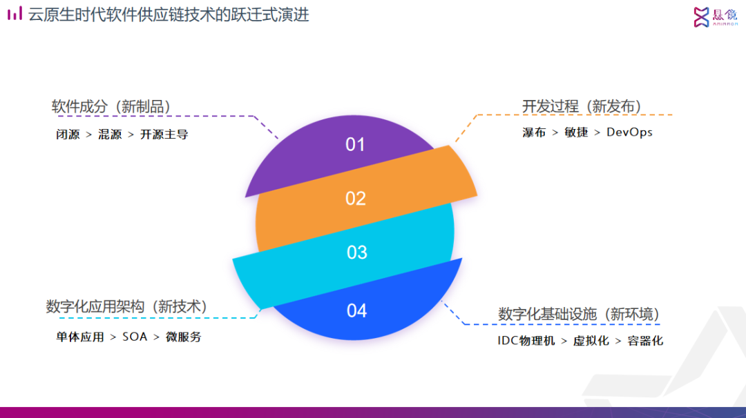 悬镜安全从云原生时代软件供应链技术的跃迁式演进中总结出了四个新的变化: