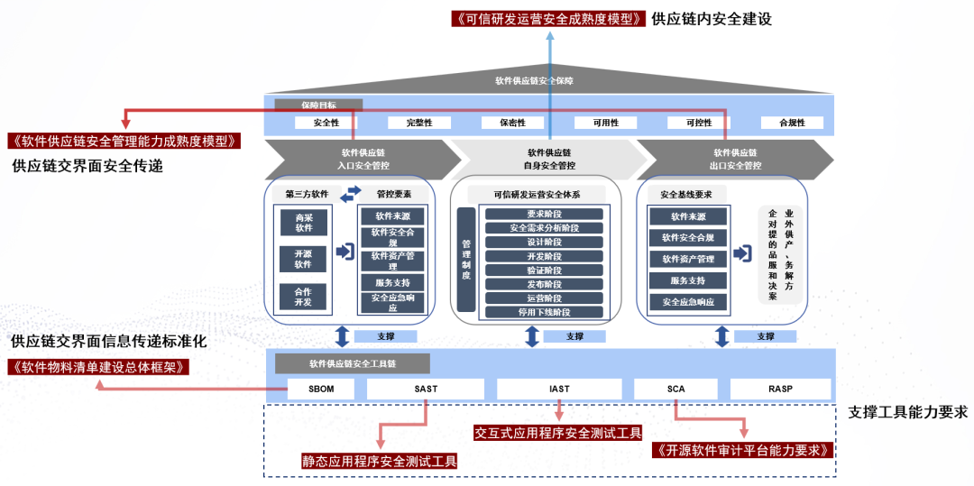 信通院致力于软件供应链安全标准体系的建设,旨在帮助企业从需求侧的角度做好软件供应链安全管理工作、建设完善的软件供应链安全管理体系并选择合适的工具产品。整个软件供应链安全系列标准体系架构包含几部分: