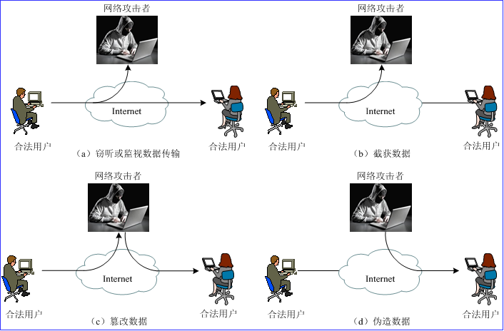 - 伪造数据:网络攻击者假冒合法的发送用户,将伪造的数据发送给合法的接收用户