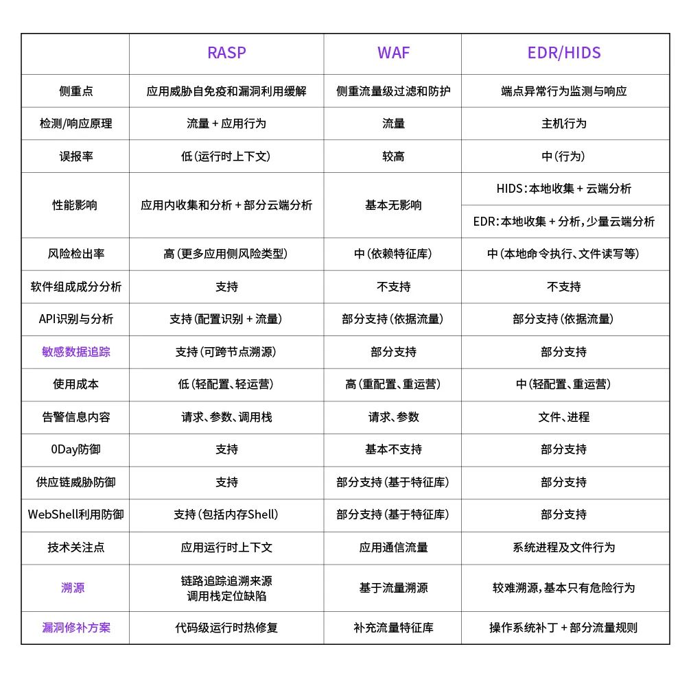 当前,企业发现0Day漏洞的手段除了主动收集威胁情报外,主要是依靠HIDS、EDR等主机侧检测与响应工具被动发现。RASP与上述工具相同,都是在最终执行敏感操作、敏感文件读取等行为时进行响应的。但不同的是,RASP相比前两款工具,具备更强的溯源与风险定位能力,除了能跟踪到跨节点之间的调用链路外,还具备代码级别的缺陷定位能力。