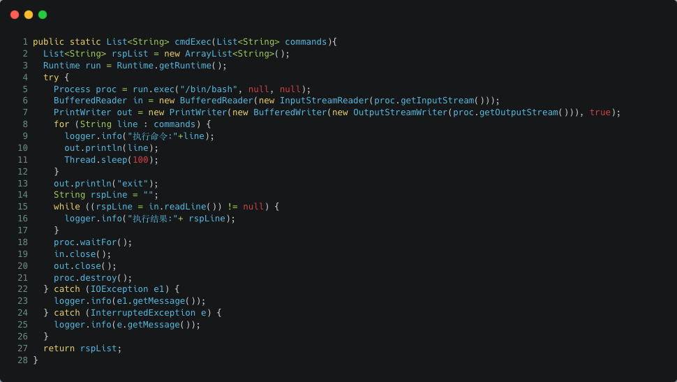 例如下述代码中,因为业务需要,应用程序需要接收用户输入来执行一些命令,但是在编写代码时却没有以白名单的形式来控制可执行命令的范围。