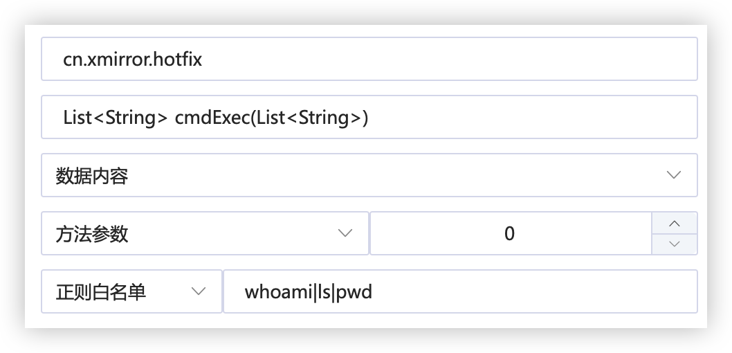 这时,就可以通过RASP应用热修复对方法入参进行判断,不允许白名单以外的命令被执行: