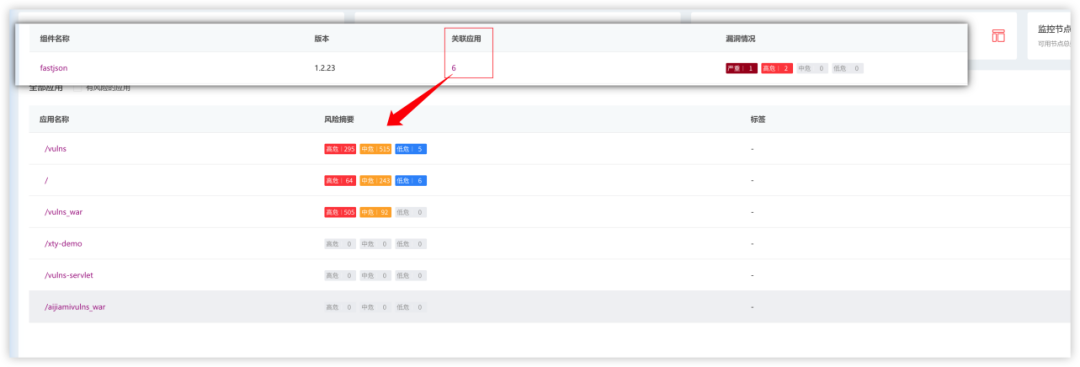 ● 若是由开源组件引入的风险,则可以根据软件成分分析,迅速定位到风险组件关联的应用,从而快速确定受影响的范围。RASP探针可以从应用中收集到其引用的第三方依赖信息,当某个组件发现漏洞后,就可以通过组件和应用的关联关系快速找到受影响的应用。如下图所示,根据fastjson:1.2.23找出了6个引用它的应用。