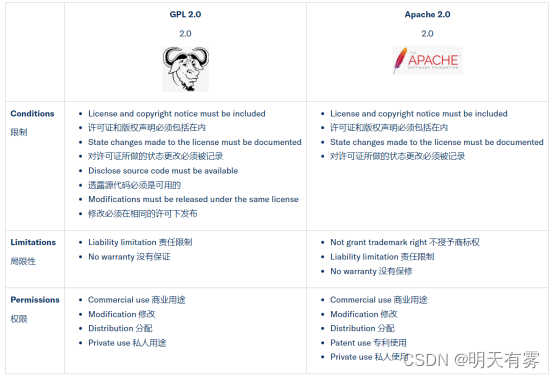 - Apache:由Apache软件基金会创建,目的是允许免费试用、修改和发布Apache许可的产品。Apache2.0属于Permissive类型的许可,但是为了合法的使用其产品,还是有一些基础的限制和许可条件。
