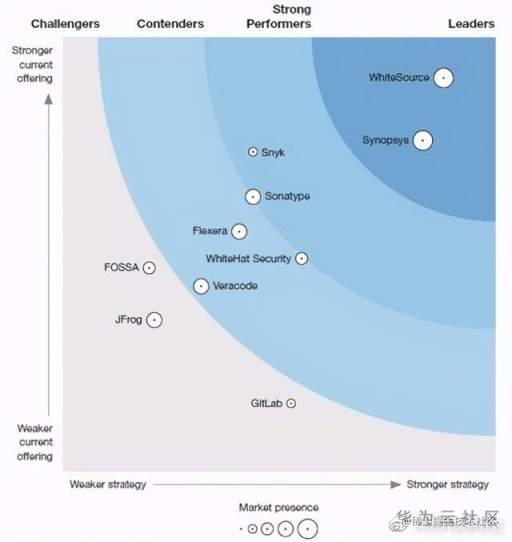 根据 Forrester 最新 SCA 报告,Forrester 通过 10 个维度(注 3)对不同工具进行打分,最后根据综合得分评选出如下业界 TOP 10 SCA 工具魔力象限图:
