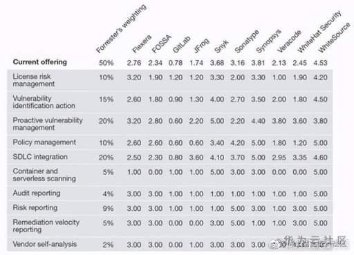 注 3: a.License 风险管理;b.漏洞识别;c.主动式漏洞管理;d.策略管理;e.SDLC 集成;f.容器和无服务器扫描; g.审计报告;h.风险报告;i.修复速度报告;j.厂商自行分析