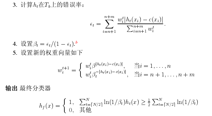 可以看到,在每一轮的迭代中,如果一个辅助训练数据被误分类,那么这个数据可能和源训练数据是矛盾的,那么我们就可以降低这个数据的权重。具体来说,就是给数据乘上一个,其中的值在0到1之间,所以在下一轮的迭代中,被误分类的样本就会比上一轮少影响分类模型一些,在若干次以后,辅助数据中符合源数据的那些数据会拥有更高的权重,而那些不符合源数据的权重会降低。极端的一个情况就是,辅助数据被全部忽略,训练数据就是源数据Tb,这样这时候的算法就成了AdaBoost算法了。在计算错误率的时候,当计算得到的错误率大于0.5的话,需要将其重置为0.5。