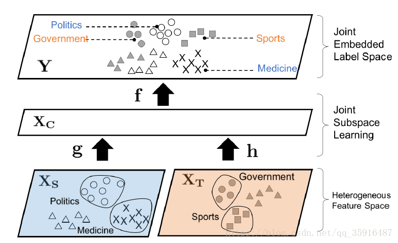 首先解释下Completely Heterogeneous Transfer Learning(CHTL),其意思就是完全异质的迁移学习,那么什么交完全异质呢,其实大家原来接触的大多迁移都是比如我学习到了如何区分猫和狗,然后我要利用这个学到的知识迁移到识别老虎的任务中,大家会发现虽然我们在训练的时候没有涉及到老虎但是猫和狗在特征分布上和老虎还是类似的,也就是说虽然sourse和target的标签空间是不重合的,但是他们的特征空间是重合的,即使不重合也有一些显式的联系。而完全异质的迁移涉及到的sourse和target的标签空间和特征空间都是不重合的。举个例子来讲就是我在英文文本上学习到的知识,我没有去迁移到其他的未见的英文文本上而是把这些知识用来了法语文本的相关任务中。