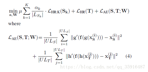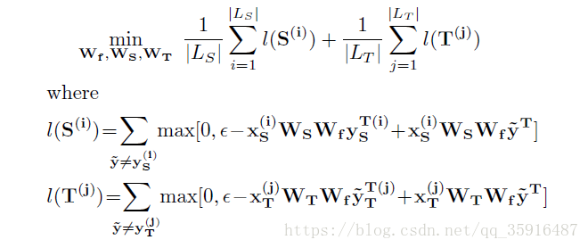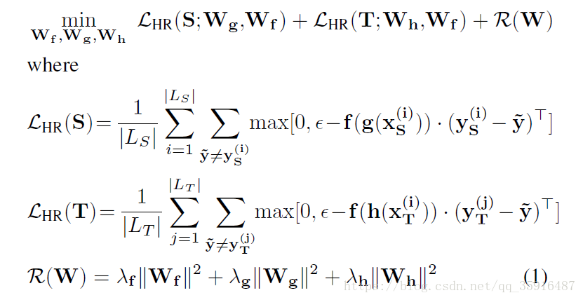 我们可以看到损失函数由两个部分构成分别是源数据集上的loss和目标数据集上的loss。然后我们仔细一看,发现问题并不简单,说好的迁移呢。为毛还有目标数据集的训练,博主欺负我读书少。然鹅事实是我们源数据集是完全标记的,然后我们的目标数据集的标记率是很低的,然后我们可以通过后续的实验我们发现这篇文章中的数据集中目标数据集的标记率是0.1,而在训练的过程中正是用的这一小部分的数据来训练的,是不是感觉0.1的标记率有点低,然而还有更低的比如one shot问题和zero shot问题不过这些极端问题一般需要一些先验知识作为辅助工具。正是因为有标记的数据需要大量的人力物力来收集,才催生了迁移学习这个领域。本人也当过苦力标记图像数据,简直不要太辛苦枯燥、乏味,而且标错了才是最让人崩溃的。所以各位同学在用人家的数据集的时候还是要满怀感激好吧。好的扯的有点远,我们回归正题,公式中的f,g,h我们前面介绍过了,然后W就是W大家都懂的。Xs是源数据,Xt是目标数据,Ys表示源数据的标签,Yt是目标数据的标签,上标i表示第i个实例,上标i表示第i个实例,表示的是数据集中不同于