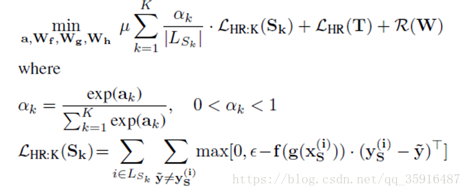 的其他标记,即除了当前处理的数据的标记外的其他的所有标记。看下第二个求和符合就知道了。这里采用了hinge rank loss,我们有必要解释下为什么要用这种形式,我们将公式展开成下面的形式可能更方便理解一点: